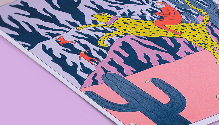 risographic print with four colors: yellow, steel, orchid, fluo orange